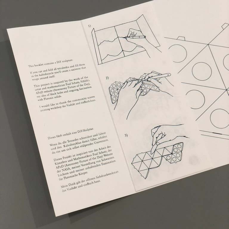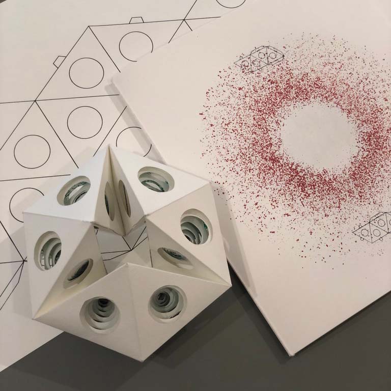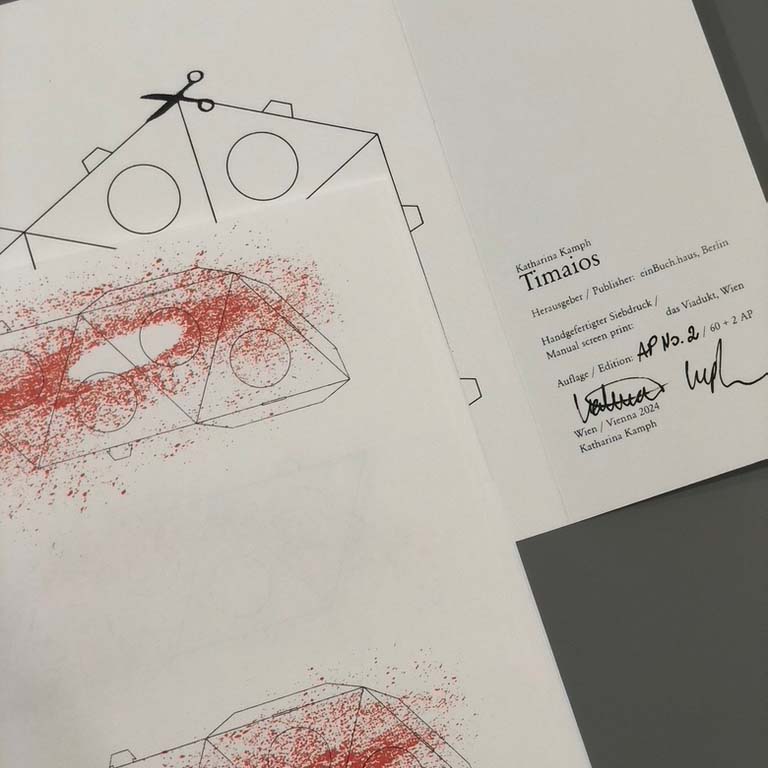 Katharina Kamph's Timaios serves as a direct reference to Plato, who provides the first description of the Platonic solids in the creation myth Timaios. The protagonists Timaios, Socrates, Kritias and Hermokrates philosophise about the origin of the world. In his lecture on natural philosophy, Timaios explains why the cosmos is shaped by two factors: reason and necessity. Since God must have created the cosmos optimally, the nature of the world is made up of four fundamental elements, whose ultimate symmetry and thus beauty imperatively explain their existence.